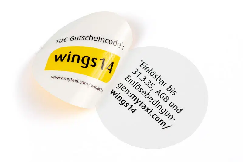 Solch kleine anschmiegsame Gewinnspiel-Etiketten aus Folie eignen sich zur zusätzlichen Beklebung Ihres Produkts: auf dem Deckel von Glas / Becher / Dose / Kartusche, auf einer Flasche, an der Seite des Coffee cups oder eines Joghurtbechers, auf Ihrer Produktverpackung usw. Sie können selbstverständlich auch in hohen Auflagen automatisch etikettiert werden.